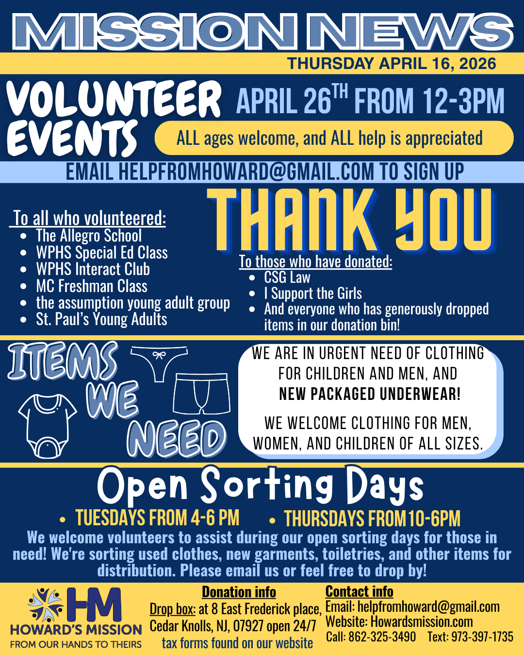 Published: Apr 16, 2026 Share: Last modified: Apr 16, 2026 Location: Cedar Knolls, NJ 07927 Target Area: County Keep up to date with Howard’s Mission!If you’re looking to donate or volunteer here’s all the information you need!!Email us at helpfromhoward@gmail.com for more!